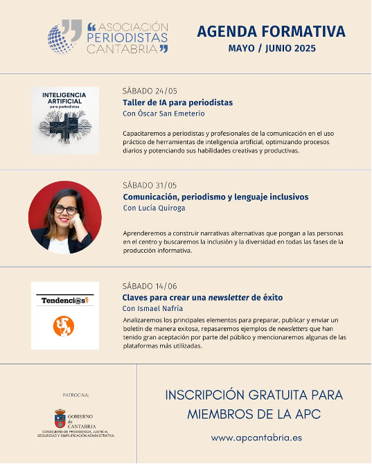 La Asociación de Periodistas de Cantabria (APC) me ha invitado a impartir una sesión formativa el próximo 14 de junio en Santander en la que hablaré de las “Claves para crear una newsletter de éxito”.