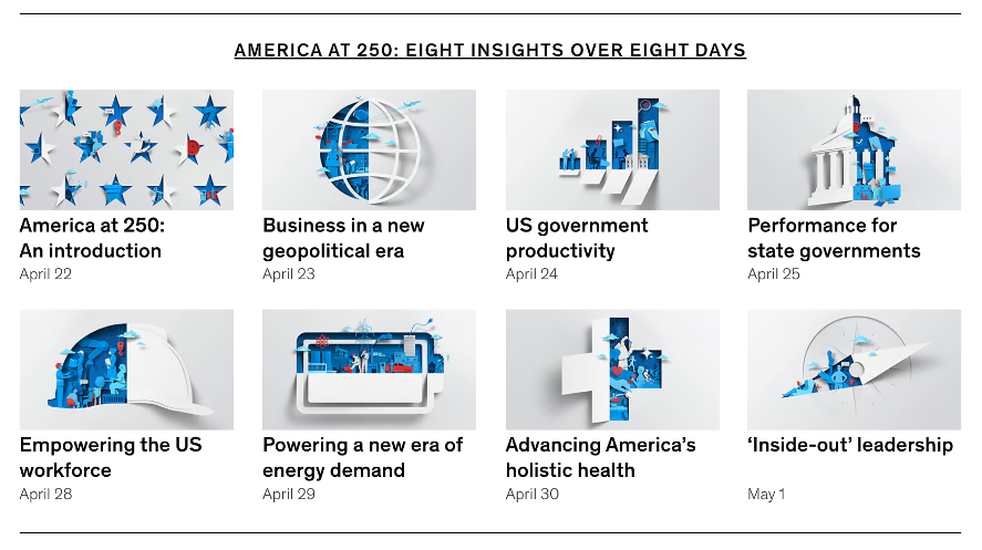 Para celebrarlo, y para colaborar en la búsqueda de nuevas ideas, el equipo de McKinsey ha publicado una serie de ocho artículos con la que quiere ayudar a los líderes, innovadores y agentes de cambio de Estados Unidos a trazar su rumbo.