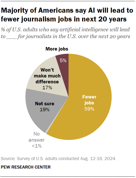 Por otra parte, la mayoría de las personas encuestadas (59%) señaló que la IA provocará una reducción de los empleos periodísticos en las dos próximas décadas.