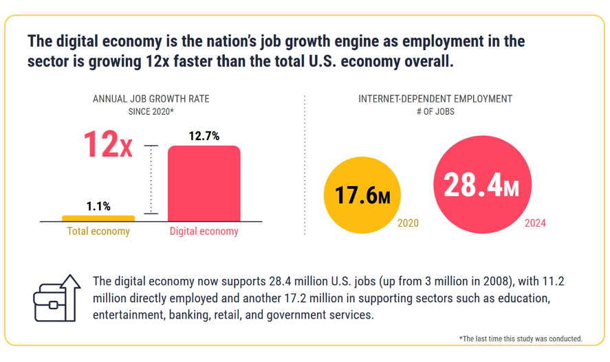 Según este estudio, que se publica cada cuatro años desde 2008, la economía digital alcanza ya los 4,9 billones de dólares y aporta 28,4 millones de empleos en Estados Unidos. Esto supone que la economía digital se ha más que doblado desde el año 2020 y representa ya el 18% del PIB de Estados Unidos.