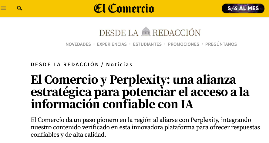 El diario peruano El Comercio firma una alianza estratégica con la empresa de IA Perplexity