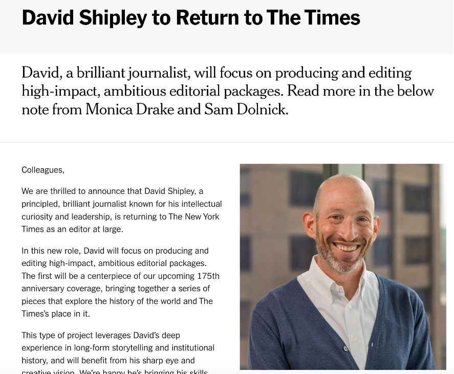 David Shipley to Return to The Times - The New York Times Company