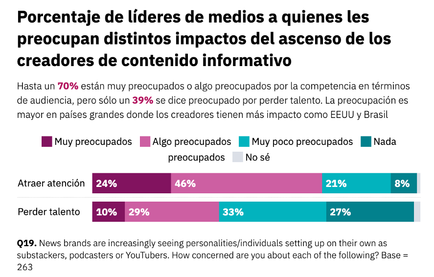 El auge de los creadores de contenidos e influencers de noticias inquieta a los líderes, por dos motivos: el 70% piensa que ese ecosistema le puede restar tiempo y atención al contenido periodístico y un 39% teme perder a sus mejores talentos a expensas de un mundo que ofrece más control y la posibilidad de obtener recompensas económicas más elevadas.