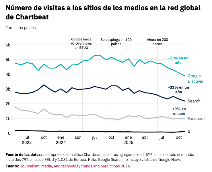 En los próximos tres años se prevé una disminución sustancial del tráfico procedente de los motores de búsqueda: no tanto como “cero Google”, pero sí superior al 40%. Según datos que proporcionó para este informe la empresa de métricas Chartbeat, ya ha comenzado a desmoronarse el tráfico agregado de cientos de sitios informativos desde las búsquedas de Google. Medios con eje en contenidos sobre estilo de vida afirman haber sido especialmente afectados por los resúmenes de IA que provee Google (“Visión general creada por IA”). Este escenario se produce tras las drásticas caídas del tráfico desde Facebook (-43%) y X/Twitter (-46%) en los últimos tres años.