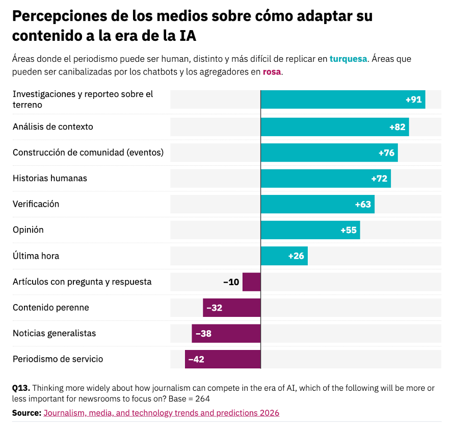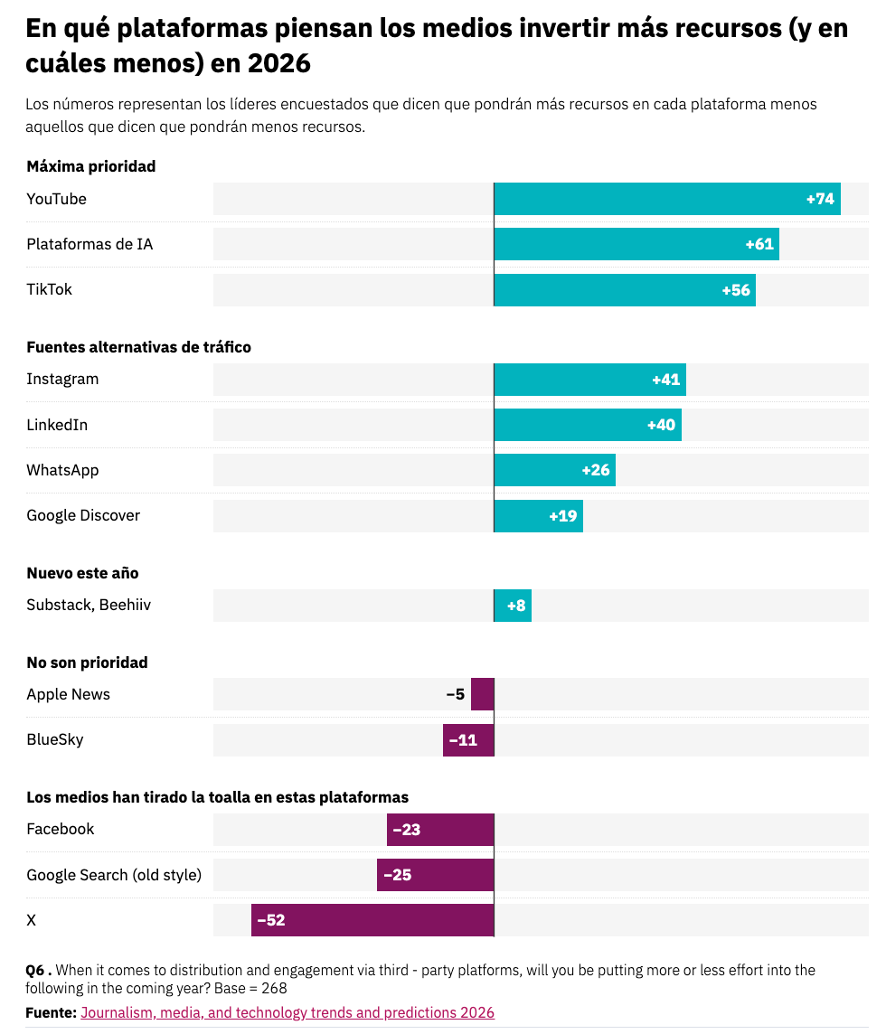 En términos estratégicos, YouTube será un foco principal de atención (puntuación neta de +74), lo que supone un incremento notable con respecto al año pasado. También aparecen entre las prioridades otras redes audiovisuales, como TikTok (+56) e Instagram (+41), y desentrañar el mejor modo de distribución en plataformas de IA como ChatGPT (de OpenAI), Gemini (de Google) y Perplexity (+61). Si bien levemente volátil, Google Discover mantiene su relevancia como fuente de tráfico (+19), al tiempo que algunos buscan nuevas audiencias en plataformas de boletines como Substack (+8). Por otro lado, los directivos piensan podar los recursos destinados a la optimización de contenidos (SEO) para Google (-25) y a las redes sociales tradicionales como Facebook (-23) y X (-52).