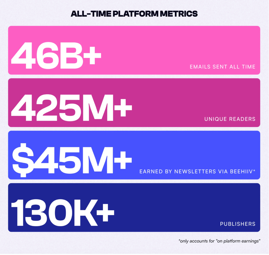 Desde los inicios de Beehiiv, se han enviado a través de esta plataforma de newsletters más de 46.000 millones de correos electrónicos que han llegado a más de 425 millones de lectores únicos. En cuando a los ingresos, la cifra global supera los 45 millones de dólares. En total, Beehiiv ha tenido ya más de 130.000 editores de newsletters.