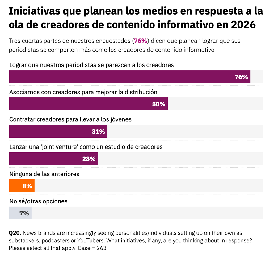 En respuesta al aumento de la competencia y a las preferencias del público por las personalidades, un 76% buscará que su personal se comporte más como los creadores. La mitad procurará alianzas con creadores para ayudar en la distribución de contenidos y un 31% directamente contratará creadores, por ejemplo, para gestionar sus cuentas en las redes sociales. Además, el 28% quiere armar estudios de creadores y facilitar iniciativas conjuntas.