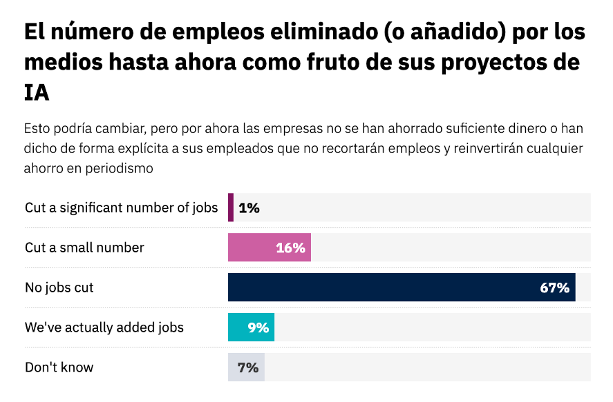 Más de cuatro de cada diez (44%) subrayan que las iniciativas de IA en sus redacciones muestran resultados “prometedores”, aunque una proporción similar (42%) los califica como “limitados”. Además, el 67% asegura que por ahora no se ha ahorrado ningún puesto laboral gracias a la eficiencia de la IA; el 16% redujo levemente la cantidad de empleados, pero el 9% ha añadido nuevos roles o costos.