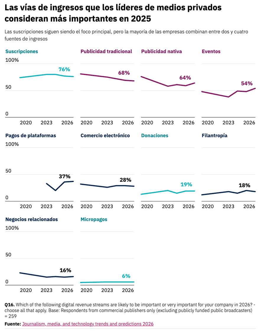 En líneas generales, las suscripciones y las membresías se mantienen como el principal foco de ingresos (76%), por delante de la publicidad (display 68%, nativa 64%). Los eventos online y en persona también cobran importancia en la estrategia de diversificación (54%). Este año disminuye la expectativa de apoyo filantrópico y de fundaciones (18%), tras los recortes de la financiación para medios en Estados Unidos y otros lugares.