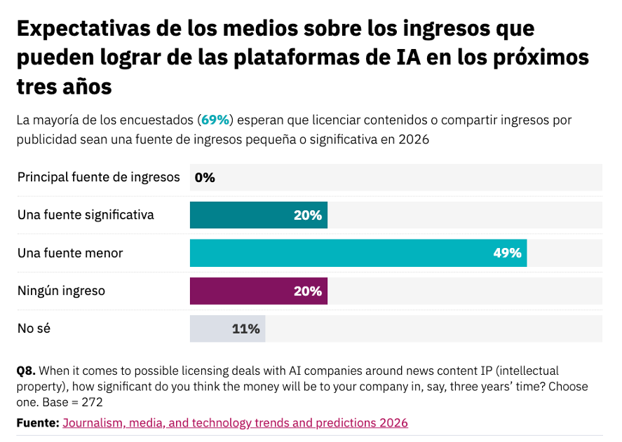Junto a la disrupción en el tráfico por causa de la IA, los líderes también ven que los chatbots brindan oportunidades de nuevos ingresos a partir de la concesión de licencias de contenido (o tomando una porción del dinero publicitario). Uno de cada cinco encuestados (20%) prevé sustanciales ingresos por estos acuerdos con empresas de IA, sobre todo en medios de alta gama. Pero la mitad estima aportes menores (49%) y otra quinta parte (compuesta en su mayoría por publicaciones locales, emisoras públicas y empresas de países pequeños) no espera obtener nada.